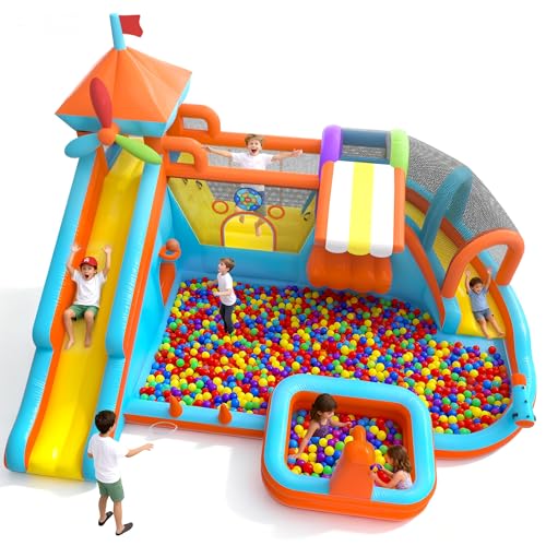 17.5×13 FT 12 in 1 Inflatable Bounce House for Kids with Double Slide, 750W Blower, Toy Stand, Jumping, Climbing Wall, Water Gun, Splash Pool, Tunnel, Basketball, Indoor, Outdoor, Orange