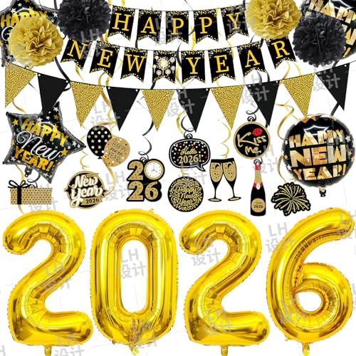 Complete 2026 New Year’s Eve Party Decoration Set: Our 2026 New Year Decoration Set includes everything you need for a perfect New Year’s celebration-1 gold and black “HAPPY NEW YEAR” banner ,1 triangle flag,4 pcs 32-inch 2026 foil balloons,2 pcs gold paper pom poms (10 inches),2 pcs black paper pom poms (10 inches),10 pcs hanging swirls,4 pcs “HAPPY NEW YEAR” meteor foil balloons