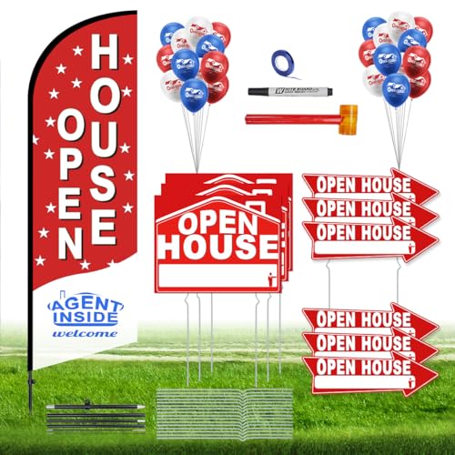 Complete Open House Kit,56-Piece Open House Set Includes: 1 Open House Flag, 3 Real Estate Open House Signs, 6 Directional Arrow Signs, and 24 Open House Balloons.