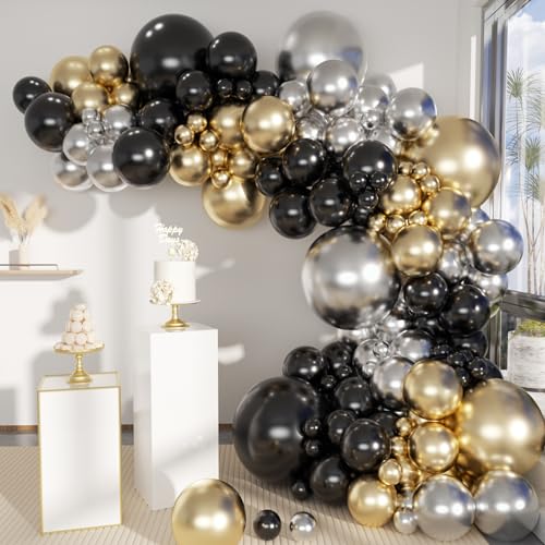 Specification: Black Gold Silver Balloons Garland Arch Kit, 141Pcs Latex Balloons Different Sizes 18 12 10 5 Inch for Party Decorations, Wedding Backdrop, Birthday, Baby Shower, Graduation