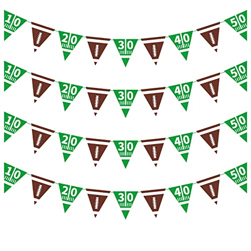 PACKAGE INCLUDING: 4 sets of both side printed triangle foodball banners. Each string is 8.9 feet long with 9 pieces flags. Each football flag panel size 7.88”x 8.86” (L x H).