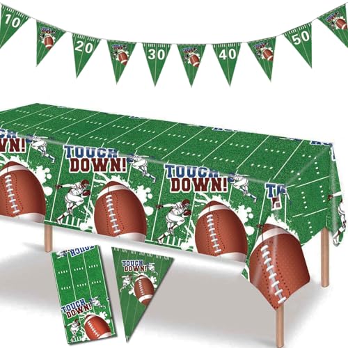 Specification: Football Party Decorations Table Cloth Favors Set, Football Field Tablecloth Rugby Game Rectangle Tablecloth Cover and Football Banner Flag for Football Themed Supplies Gift Celebration Decor