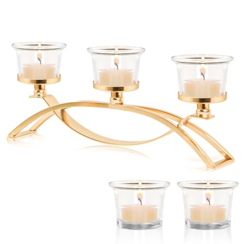 Specification: Gold 3-Arm Metal Tea Light Candle Holder Set with 5 Glass Cups, Votive Candle Holders Centerpiece Candelabra for Wedding Table Decor, Home Gatherings and Holidays