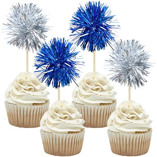 Gyufise 30Pcs Foil Firework Cupcake Toppers Sparkle Tinsel Cake Toppers Tinsel Drink Cake Decoration Cocktail Picks for Birthday Wedding Graduation Party Supplies Silver Dark Blue