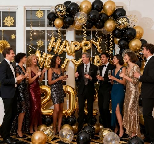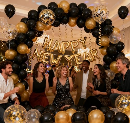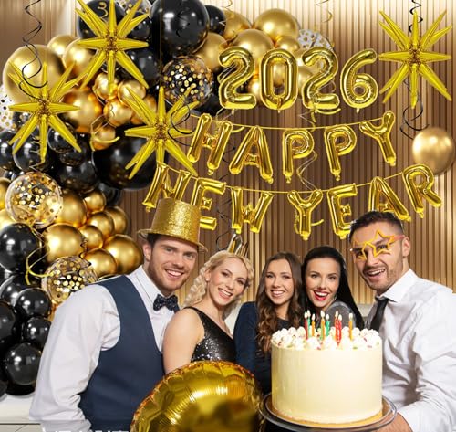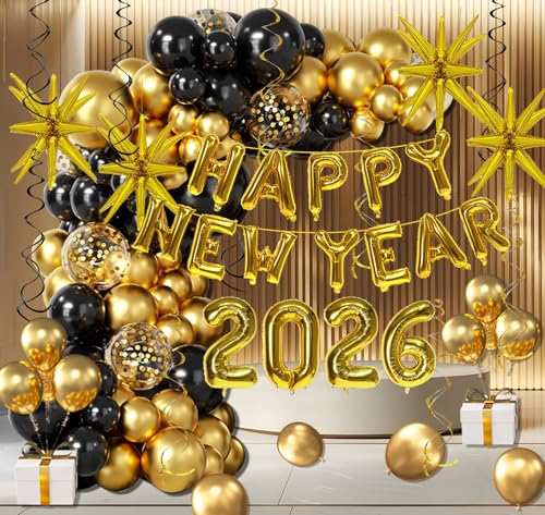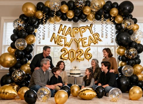 Specification: KALOR Happy New Year Party Decorations, 142 pcs Black and Glod Balloon Garlands Arch Kit, Happy New Year 2026 Balloon Banner, Black and Glod Hanging Swirls for NYE Decorations 2026