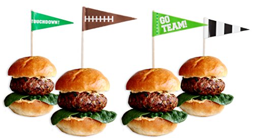 Use these Football Cupcake Picks for bite-sized appetizers and desserts on game day or at a football-themed birthday party! These party picks are decorated with bright green flags that are printed with black and white referee stripes, football stitches, or messages like “Touchdown!” and “Go Team!”