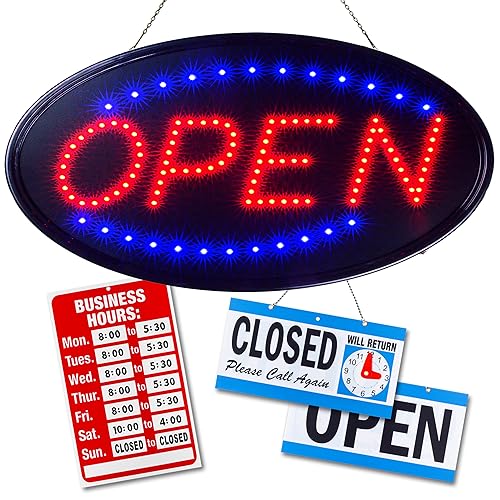 Neon Open Sign for Business: Oval LED Sign with Flashing Mode for Stores – Includes Business Hours and Open & Closed Signs