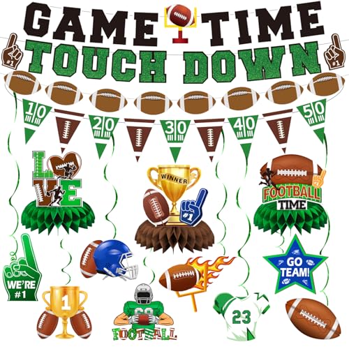 Football Decorations for Party Package Including: Our package 1 pcs football party decorations Game Time football banner, 1 pcs Touch Down football banner, 2 pcs football themed triangle flags & football banner, 3 psc football honeycomb, 8 pcs football hanging swirls. Perfect for creating party decorations football party atmosphere that’s sure to impress your guests.