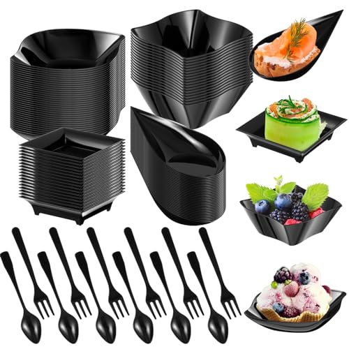 Specification: Tessco 200 Pcs Mini Appetizer Plates with Spoons Forks Disposable Mini Dessert Plates Plastic Appetizer Bowls Tiny Individual Serving Trays for Party(Black,Classic)