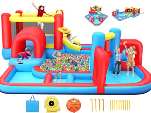 🏰【COMPLETE STARTER KIT】:Everything you need in one package! Includes: powerful 520W air blower for quick inflation, durable inflatable basketball for added fun, 10 heavy-duty ground stakes and 4 blower stakes for maximum stability, convenient 20″ carrying bag for easy storage and transport, repair kit for maintenance, and comprehensive setup instructions. Start the fun right away!